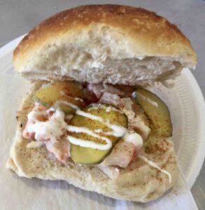 A great favourite . A filled roll with local lobster, fresh thinly sliced gherkin, mayo & a dusting of cayenne pepper