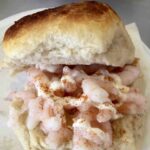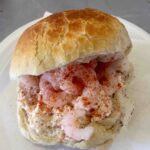 A great favourite . A filled roll with local lobster, fresh thinly sliced gherkin, mayo & a dusting of cayenne pepper